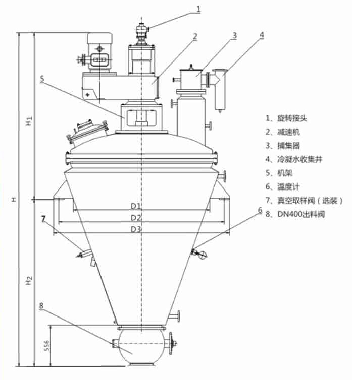 錐形螺帶真空混合/干燥機(jī)是集混合、干燥及蒸餾為一體的多功能設(shè)備,采用全密閉GMP清潔設(shè)計,它的干燥效率是同等規(guī)格(雙錐回轉(zhuǎn)真空干燥機(jī))的3-5倍,裝料量是(雙錐回轉(zhuǎn)真空干燥機(jī))的2倍,相對效能提高6-10倍。螺帶攪拌器可使物料實(shí)現(xiàn)自下而上螺旋循環(huán)的攪拌效果,能得到高效的傳熱特性,物料裝填率在30%-100%情況下工作,可得到100%的加熱面積的利用效率。它是節(jié)能、高效、環(huán)保清潔的新型干燥設(shè)備。 技術(shù)參數(shù):